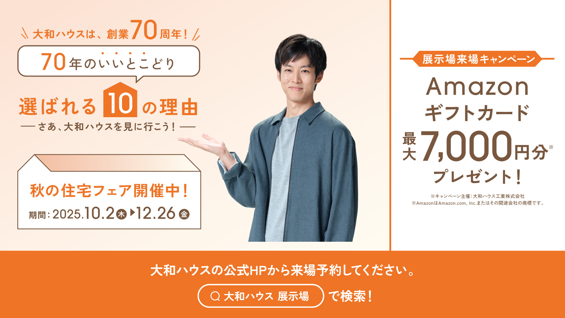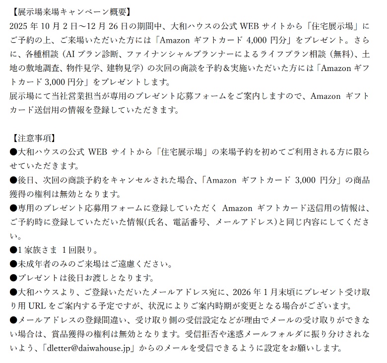 当社公式WEBサイトから【みらいえ展示場】をご予約&ご来場でAmazon ギフトカード 4,000 円分をプレゼント!
